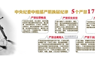 “5個嚴禁”“17”個不準”和“5個一律” “5個嚴禁”: 嚴禁拉票賄選、嚴禁買官賣官、嚴禁跑官要官、嚴禁違規用人、嚴禁干擾換屆“17個不準”: 1、不準在民主推薦、民主測評、組織考察和選舉中搞拉票等非組織活動,通過宴請、安排消費活動、打電話、發短信、當面拜訪、委托或者授意中間人出面說情、舉辦聯誼活動等形