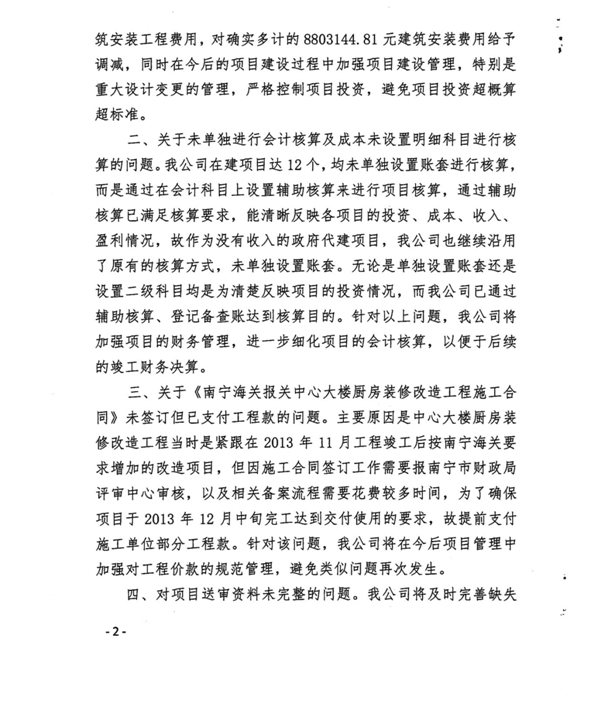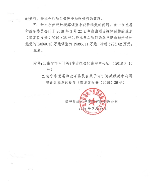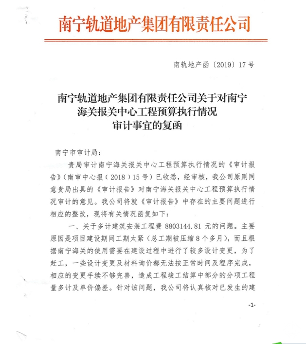 南寧軌道地產集團有限責任公司關于對南寧海關報關中心工程預算執行情況審計事宜的復函