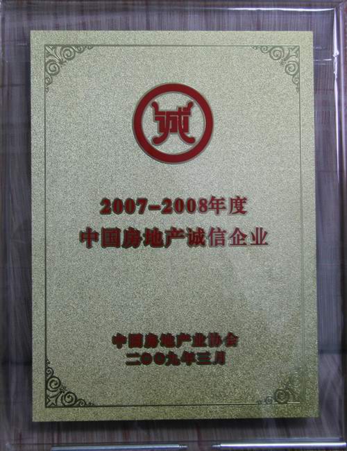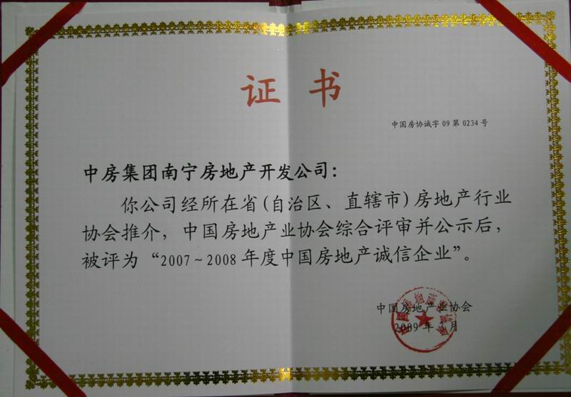 熱烈祝賀中房集團南寧房地產開發公司榮獲2007-2008年度中國房地產誠信企業