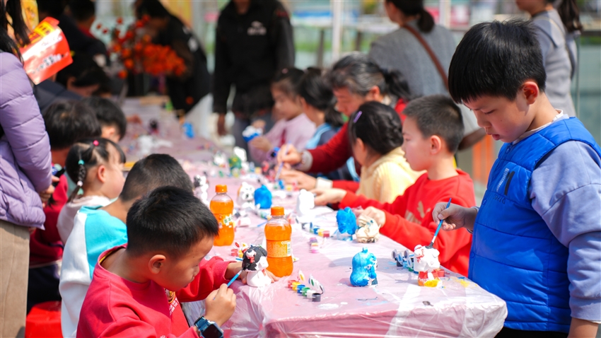 在創意手作區,也吸引了眾多小朋友的目光。在這里大家可以用黏土塑造哪吒,用彩筆描繪敖丙,用糖畫勾勒太乙真人。還可以體驗漆扇、香囊等非遺手作。各種創意手作活動讓大小朋友們感受到了民俗文化與哪吒元素的奇妙融合,玩得不亦樂乎!